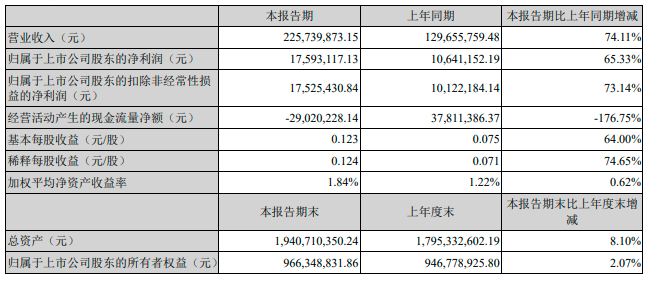 公告显示,2022年第一季度公司营业收入2.26亿元,同比增加74.11%;归属于上市公司股东的净利润1759.31万元,同比增加65.33%;归属于上市公司股东的扣除非经常性损益的净利润1752.54万元,同比增加73.14%;基本每股收益0.123元,同比增加64%。