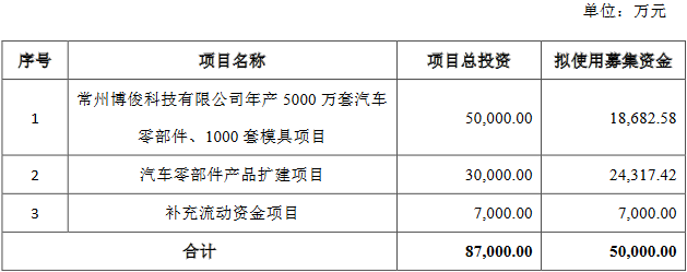 博俊科技本次发行拟募集资金总额不超过50,000.00万元(含50,000.00万元),扣除发行费用后,拟用于常州博俊科技有限公司年产5000万套汽车零部件、1000套模具项目、汽车零部件产品扩建项目和补充流动资金项目。