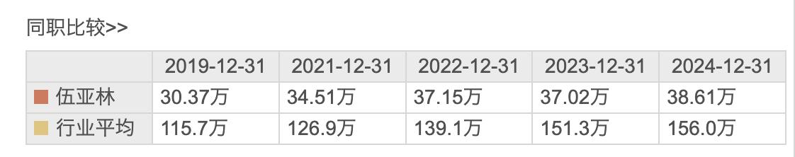 东方财富数据显示,2020年至2024年,伍亚林薪酬分别为30.37万元、34.51万元、37.15万元、37.02万元、38.61万元。
