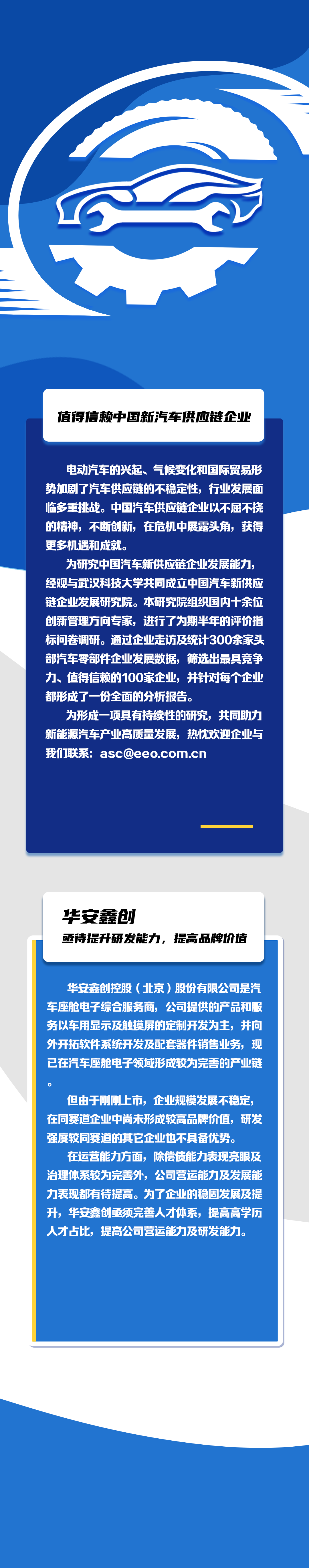华安鑫创控股(北京)股份有限公司(以下简称“华安鑫创”)成立于2013年1月25日,2021年1月6日于深交所创业板上市,是一家汽车座舱电子综合服务商,主营业务为汽车中控和液晶仪表等座舱电子产品的核心显示器件定制选型、软件系统开发及配套器件的销售。作为一家新上市的企业,华安鑫创不同于传统意义的制造商、分销商及软件服务商,它能够以一个窗口对外提供包括软、硬件定制开发及产品销售的一揽子解决方案,以达到有效整合软件和硬件、通用和定制等不同的业务资源及商业机会的目的。
