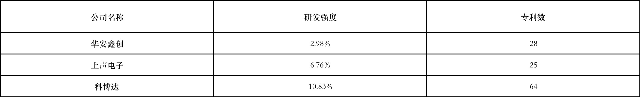 ——需提高对研发强度的关注程度。2021年华安鑫创、上声电子及科博达的研发投入分别为2157.77万元、6139.66万元、30401.58万元,研发强度分别为2.98%、6.76%、10.83%。由此可见,华安鑫创在智能座舱赛道的研发投入及强度是最低的,亟需提高对研发的重视程度。