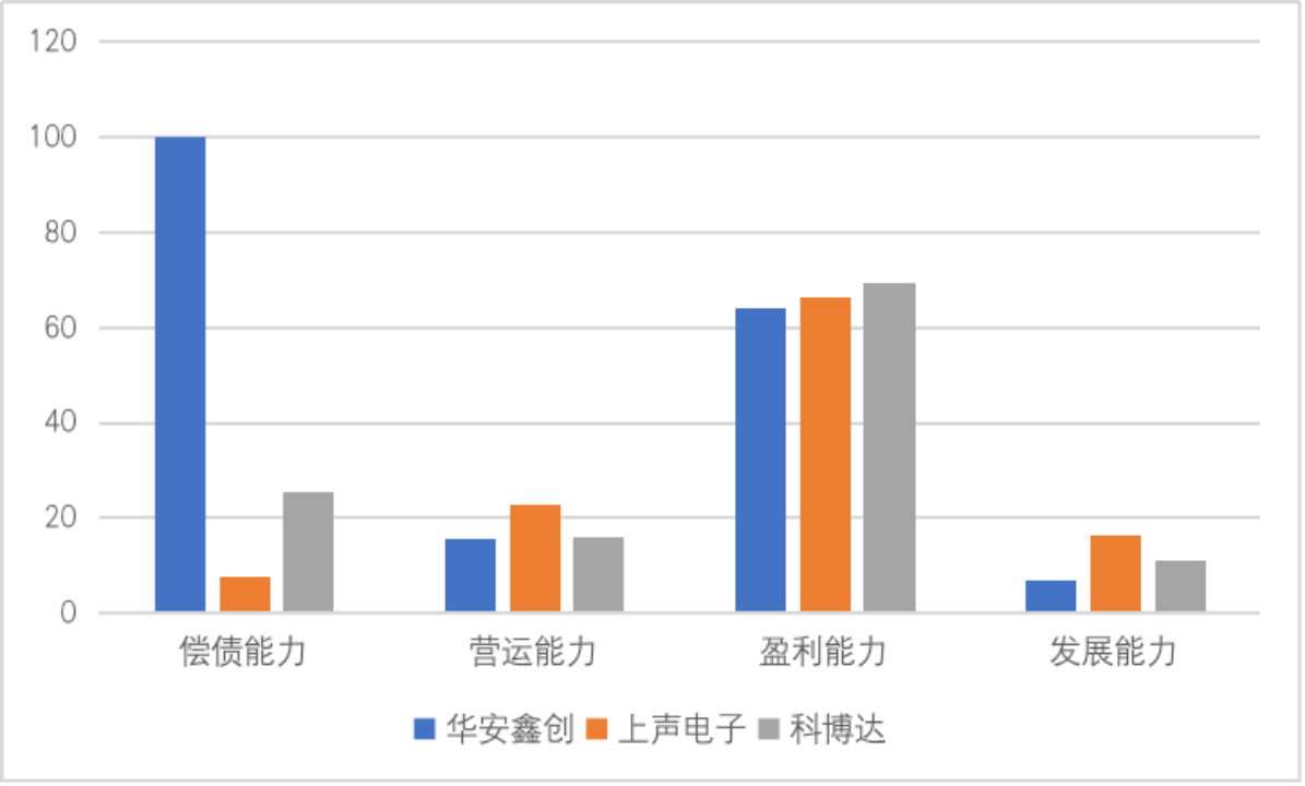 ——运营能力有待提高。从财务角度看,企业营运能力及发展能力不强。2021年,华安鑫创、上声电子及科博达的营运能力评分分别为15.50、22.92、16.01,发展能力评分为6.87、16.31、11.15。由上述数据可看出华安鑫创的营运能力评分及发展能力评分都位于赛道末尾,说明华安鑫创亟须提高存货周转率及总资产周转率,加速企业资产流通,为企业创造更大扩展空间。