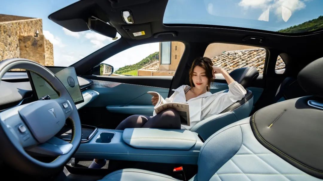 新车整体采用撞色处理,并在多处细节加入镀铬元素进行点缀,整体十分年轻。中控部分搭载了华安鑫创提供的 2.5K 分辨率 15.4 英寸“向日葵”屏幕。座舱 90%的接触面都采用了软包,副驾提供了“女王座椅”,搭配了电动腿托、座椅通风、座椅加热等舒适性功能。在其他方面,新车还提供全景天幕、后排空调出风口、HUD抬头显示、手机无线充电等,配置一应俱全。