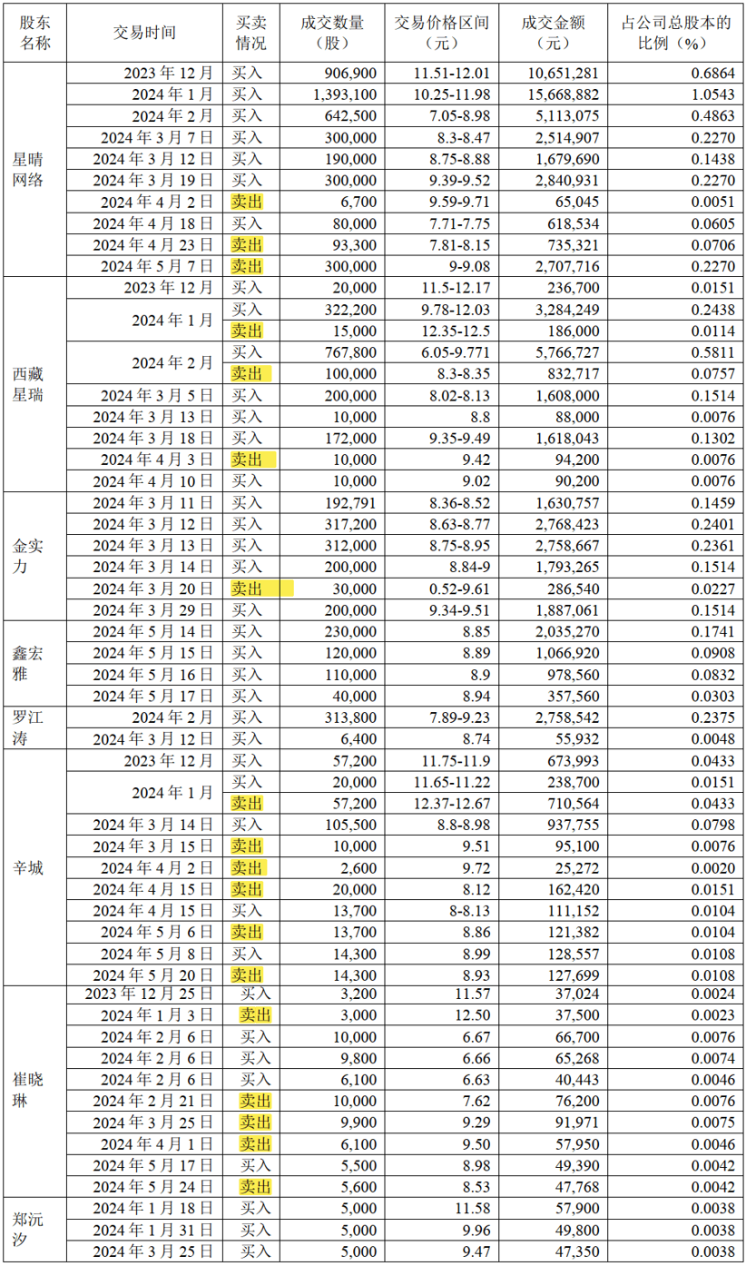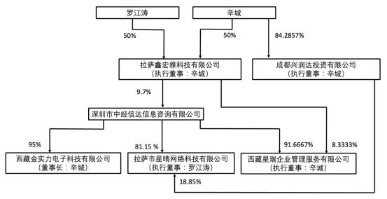 此次举牌始于2023年12月至2024年5月,举牌方为拉萨市星晴网络科技有限公司(简称“星晴网络”)、西藏星瑞企业管理服务有限公司(简称“西藏星瑞”)、拉萨鑫宏雅科技有限公司(简称“鑫宏雅”)、西藏金实力电子科技有限公司(简称“金实力”)、罗江涛、辛城、崔晓琳、郑沅汐。其中,崔晓琳为西藏星瑞监事宋旭配偶;郑沅汐为金实力董事王和平配偶,星晴网络、西藏星瑞、金实力穿透后指向罗江涛、辛城(如下图)。