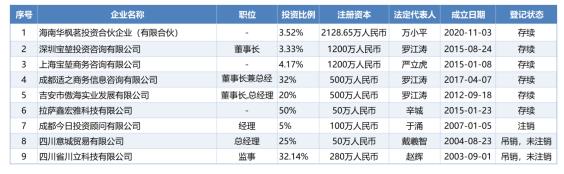 罗江涛、崔晓琳、郑沅汐住所均为成都,辛城住所为深圳,通讯地址为重庆。天眼查数据显示,罗江涛参股了多家公司(如下图):