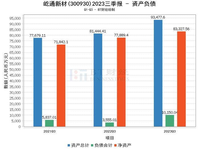 从资产负债方面来看,屹通新材2023年三季度末的总资产为9.35亿元,相较于上年度末的8.47亿元有所增长。负债合计为1.02亿元,相较于上年度末的4681.39万元增长明显。净资产为8.33亿元,较上年度末的8亿元略有增长。资产负债率为10.86%,较上年度末的5.53%有所上升。