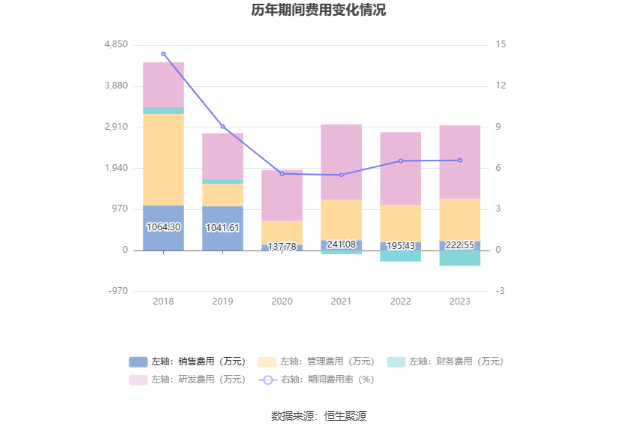 2023年,公司期间费用为2586.57万元,较上年同期增加56.87万元;期间费用率为6.58%,较上年同期上升0.04个百分点。其中,销售费用同比增长13.88%,管理费用同比增长13.55%,研发费用同比增长0.93%,财务费用由去年同期的-260.34万元变为-365.72万元。