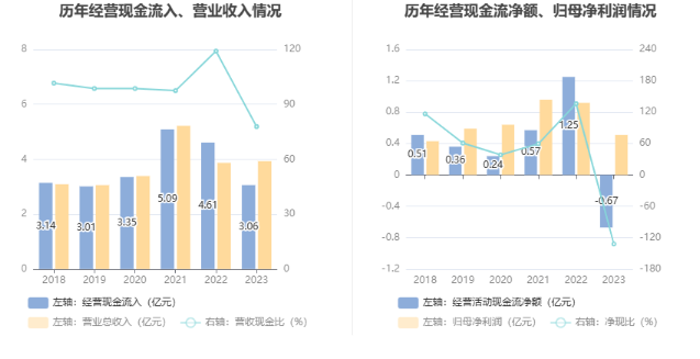 2023年,公司经营活动现金流净额为-6669.85万元,同比减少1.91亿元;筹资活动现金流净额-1000.00万元,同比持平;投资活动现金流净额-1.21亿元,上年同期为1.26亿元。