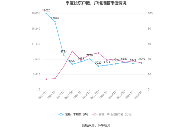 筹码集中度方面,截至2023年年末,公司股东总户数为6805户,较三季度末增长了184户,增幅2.78%;户均持股市值由三季度末的37.89万元下降至35.15万元,降幅为7.23%。