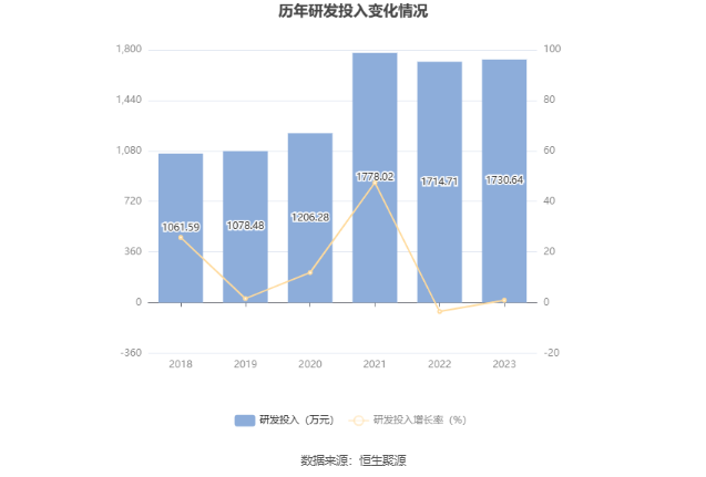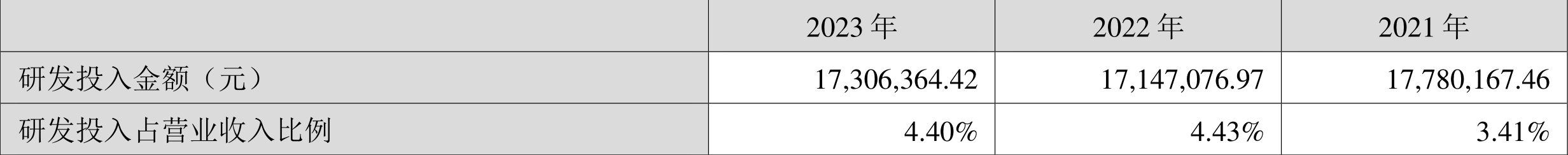 2023年全年,公司研发投入金额为1730.64万元,同比增长0.93%;研发投入占营业收入比例为4.40%,相比上年同期下降0.03个百分点。此外,公司全年研发投入资本化率为0。