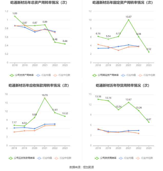 营运能力方面,2023年,公司公司总资产周转率为0.44次,上年同期为0.48次(2022年行业平均值为0.73次,公司位居同行业15/16);固定资产周转率为2.52次,上年同期为6.06次(2022年行业平均值为3.84次,公司位居同行业4/16);公司应收账款周转率、存货周转率分别为10.32次、6.87次。