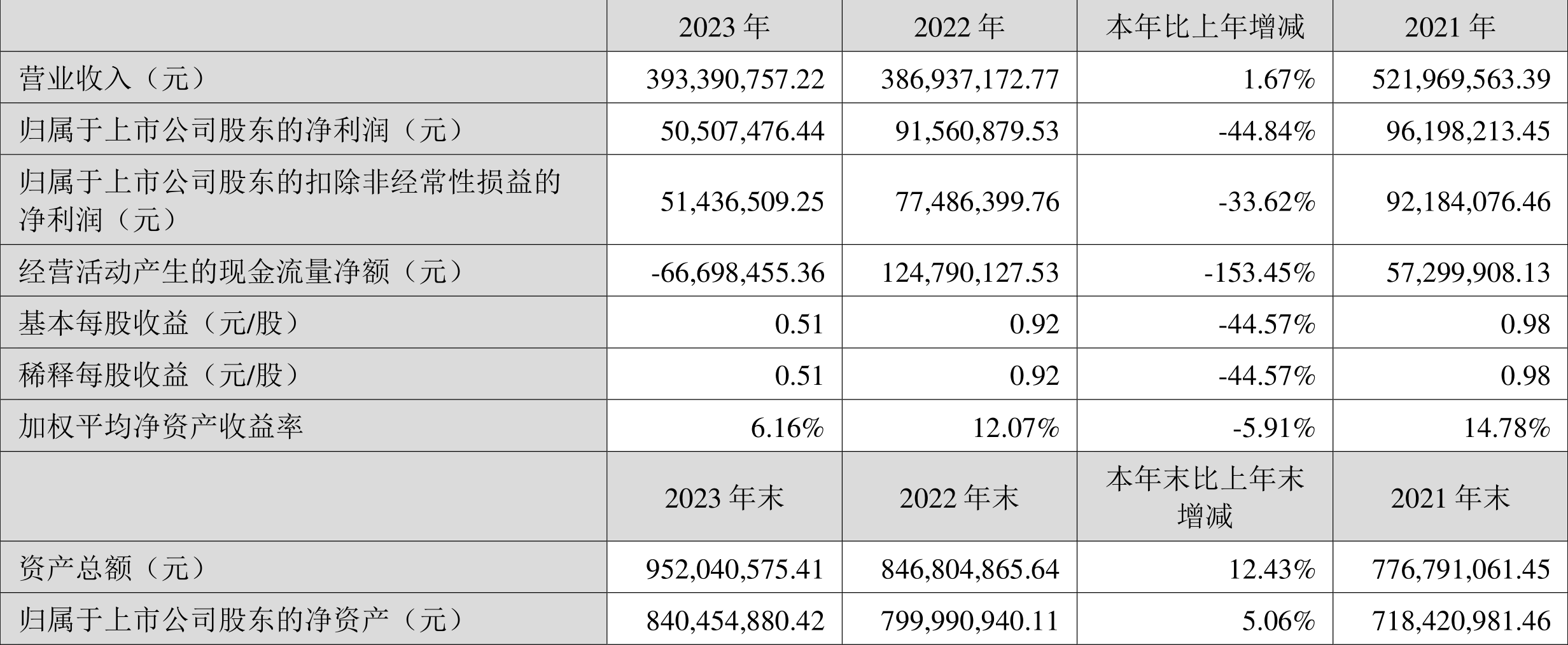 屹通新材(300930)4月23日披露2023年年报。2023年,公司实现营业总收入3.93亿元,同比增长1.67%;归母净利润5050.75万元,同比下降44.84%;扣非净利润5143.65万元,同比下降33.62%;经营活动产生的现金流量净额为-6669.85万元,上年同期为1.25亿元;报告期内,屹通新材基本每股收益为0.51元,加权平均净资产收益率为6.16%。公司2023年年度利润分配预案为:拟向全体股东每10股派1元(含税)。