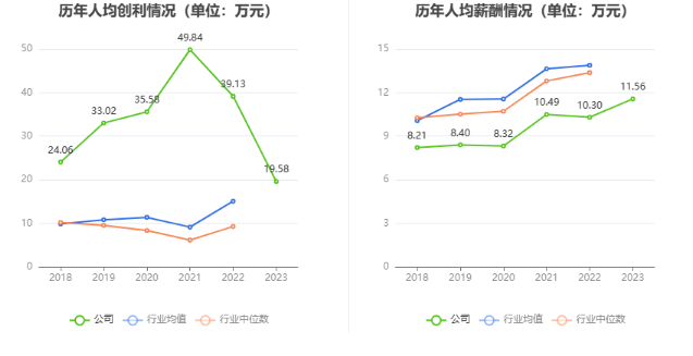 截至2023年末,公司员工总数为258人,人均创收152.48万元,人均创利19.58万元,人均薪酬11.56万元,较上年同期分别变化-7.79%、-49.97%、12.19%。