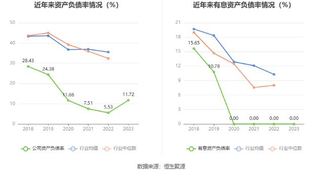 在偿债能力方面,公司2023年年末资产负债率为11.72%,相比上年末上升6.19个百分点;有息资产负债率为0,相比上年末基本持平。
