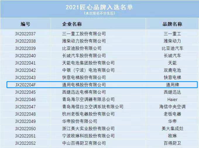 2022年3月1日,匠心品牌评价结果闪亮公布。在春暖花开的日子里,通用电梯也迎来了好消息,“通用牌”荣获2021年“匠心品牌”名誉称号!
