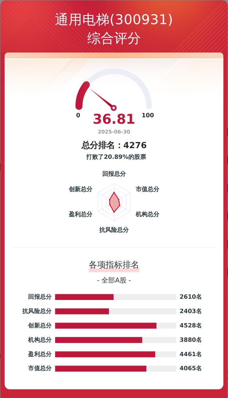 金融界上市公司研究院构建了一套上市公司韧性评价体系,从企业盈利、科技创新、股东回报、经营抗风险、市值表现及机构吸引力六个维度对企业进行量化评分,满分为100分。通用电梯的韧性评价总分为36.81分,在A股5405家可比上市公司中排名第4276位。