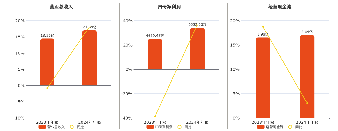 公司营业总收入为21.68亿元,在已披露的同业公司中排名第44。归母净利润为6332.06万元,在已披露的同业公司中排名第61。经营活动现金净流入为2.04亿元。