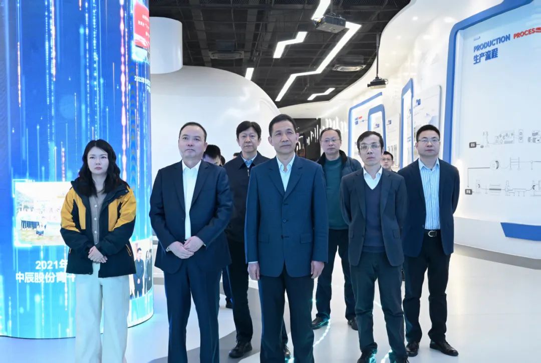 曹总一行走进中辰股份智能科技展厅和党群服务驿站,详细听取公司发展历程、产业链结构、标杆案例及发展规划等讲解,深入了解中辰在工业4.0转型和传统电线电缆质量检测环节的5G场景应用情况。