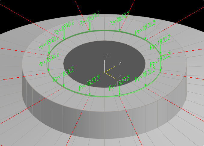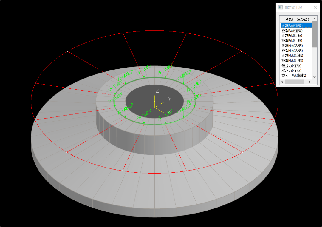 盈建科风机基础软件支持有限元算法和规范算法。有限元算法中风机荷载是通过矮墙(软件自动生成100mm高的矮墙)传递荷载,矮墙上有12个节点、划分为12段,关于竖向力、水平力、弯矩在12个节点的分配,具体可参考技术周刊2023年第43期《风机塔架基础设计中不可忽视的几个关键问题(下)》。