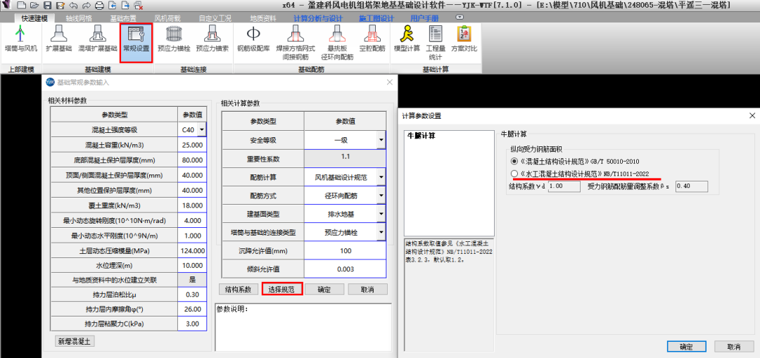 具体操作是:在【常规设置】菜单中点击【选择规范】按钮,在弹出的【牛腿计算】菜单中,【纵向受力钢筋面积】选择《混规》或《水工混规》,《水工混规》下需设置结构系数γd和受力钢筋配筋量调整系数βs。