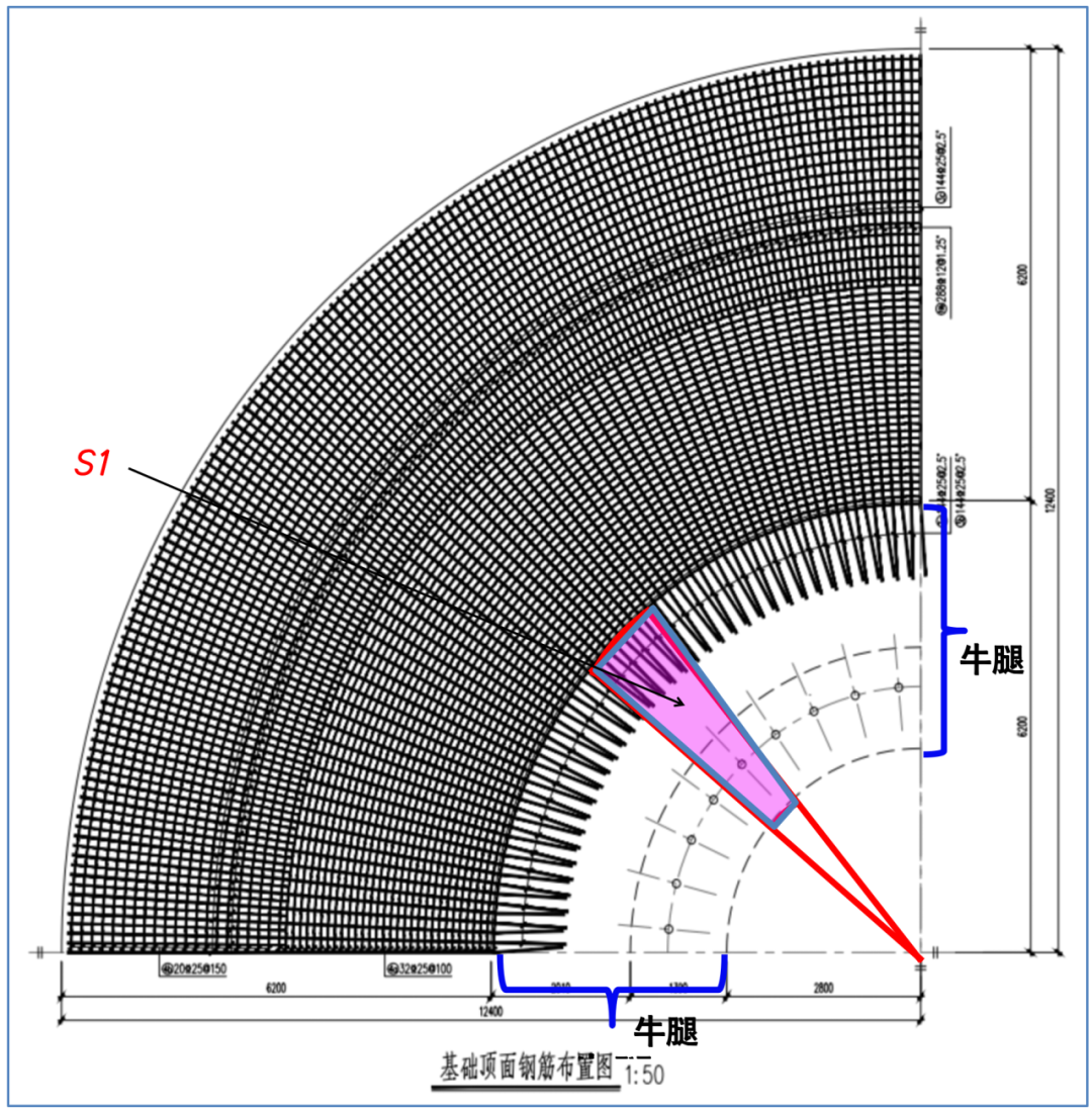 混塔基础空腔上部环壁可以看作柱牛腿进行计算,在问题三中,我们已经知道,牛腿根据预应力锚索的数量进行划分,每个计算单元包含一组预应力锚索。如下截图,其中S1 为计算单元的扇环形净面积。