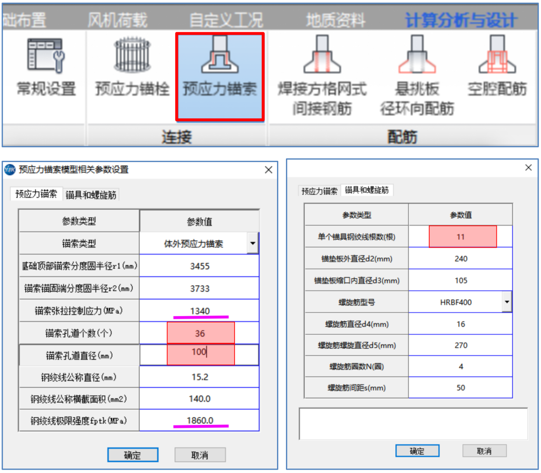 根据以上分析,在【预应力锚索】菜单中输入锚索孔道个数36、锚索孔道直径100、单个锚具钢绞线根数11,并按总说明把锚索张拉控制应力、钢绞线极限强度值也输入。