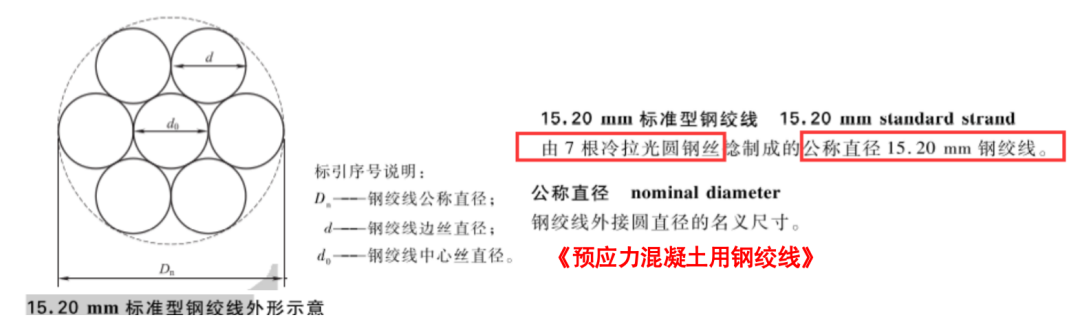 根据《预应力混凝土用钢绞线》,公称直径是15.2mm的钢绞线,是指由7根冷拉光圆钢丝捻制而成的一根钢绞线,如下图。11根这样的钢绞线放到一个锚具中,形成一束钢绞线也就是一根锚索。一共有36根锚索,即36束钢绞线,一根锚索有一个孔道,共36个孔道,每个孔道直径是100mm。