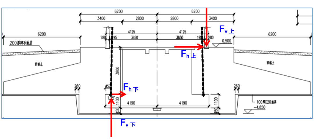 在塔筒和预应力锚索作用下,牛腿顶部受到塔筒底部传递的水平力Fh上和竖向力Fv上;牛腿底部受到锚索产生的水平力Fh下和竖向力Fv下,如下图。