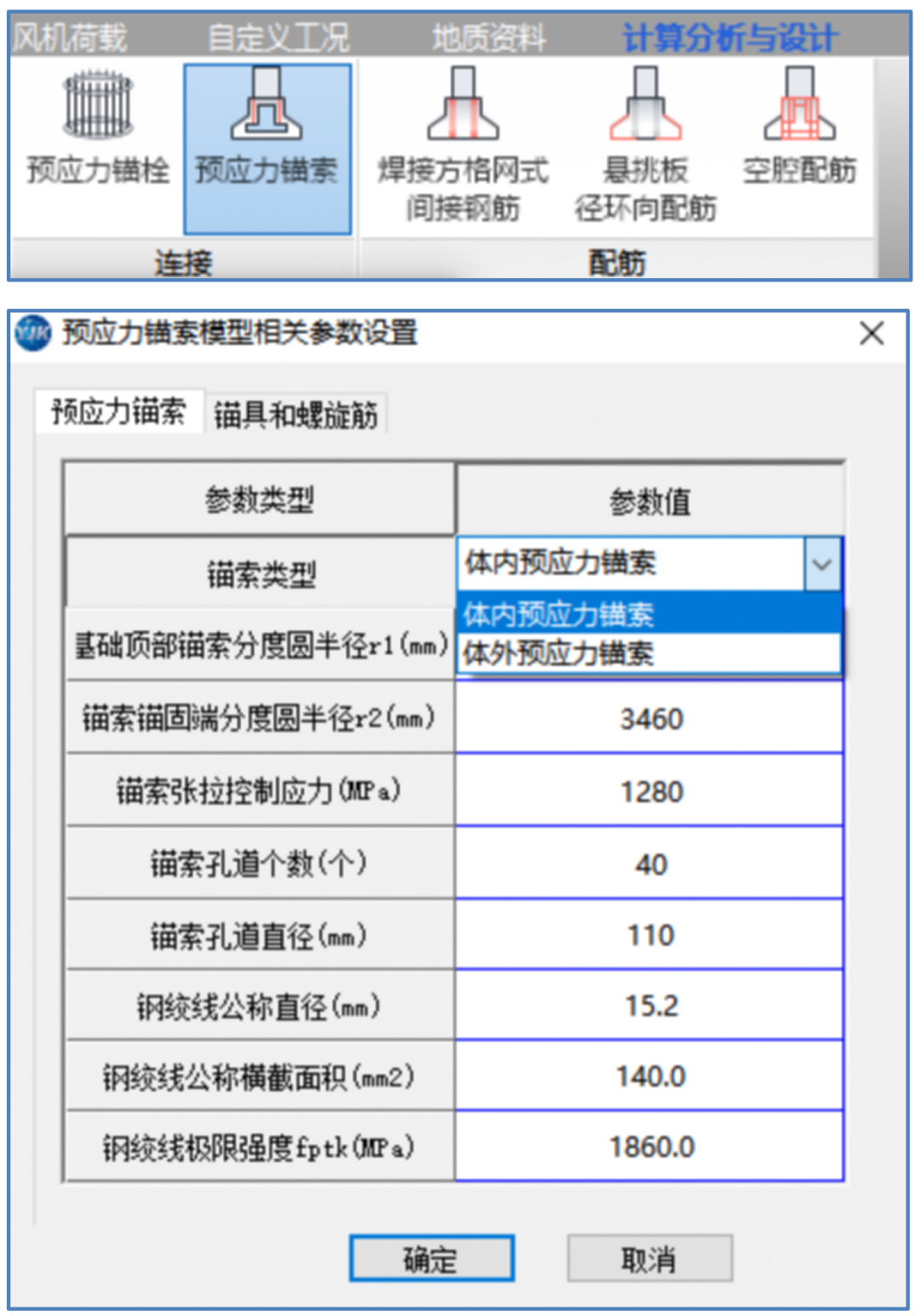 软件中在【预应力锚索】菜单下,选择体内预应力或体外预应力进行设置。