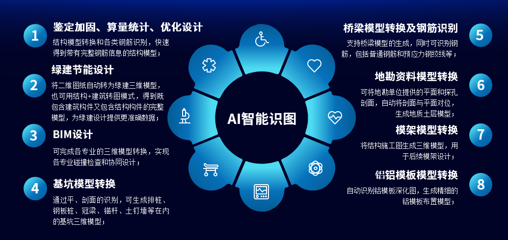 值得重点关注的是,盈建科 BIM 软件系列背后,还依托着一套覆盖多领域、功能强大的 AI 智能识图技术体系。BIM 设计仅是其众多应用场景之一,其在工程全链条的深度赋能,更凸显出盈建科在技术研发上的前瞻性与全面性。