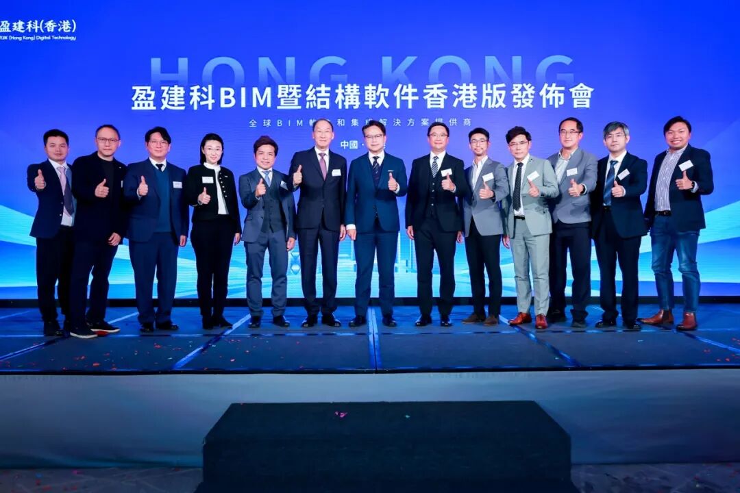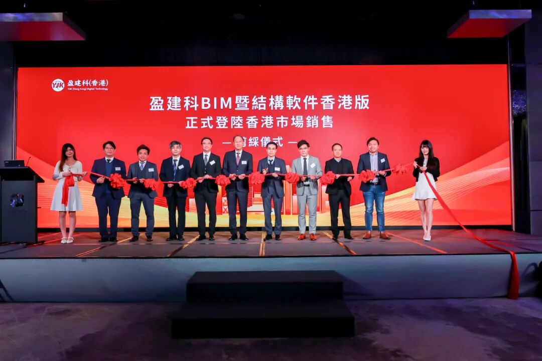 发布会核心环节,香港发展局代表邓启恩、香港建造业议会代表何烱光、 盈建科 代表陈岱林、李保盛、王贤磊、誉锋顾问代表黄世财、黄春权、建盛(亚洲)工程代表卢德辉及测建行代表余颂昇共同上台剪彩,正式宣布 盈建科 BIM及结构软件香港版重磅发布,为香港建造业数字化转型与多元化发展注入新动能。