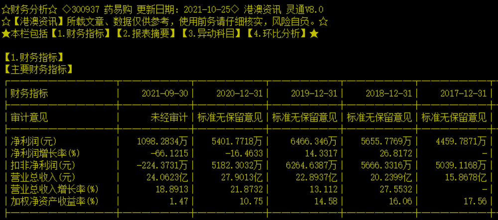 据三季报披露,药易购2021年前三季度营业收入24.06亿元,同比还能有18.89%的增幅,但净利润只有1098.28万元,同比下滑了66.12%,而其扣非净利润更为负数,为-224.37万元,同比由盈转亏。而2020年同期的扣非净利润却能高达5182.3万元。