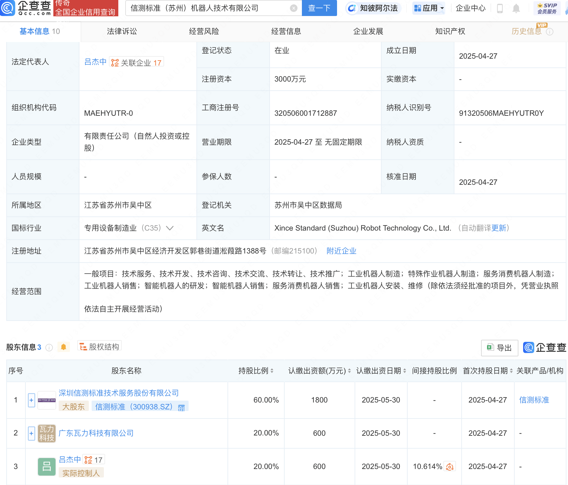 近日,信测标准(苏州)机器人技术有限公司成立,法定代表人为吕杰中,注册资本3000万元,经营范围包含:工业机器人销售;智能机器人的研发;智能机器人销售;服务消费机器人销售等。股权穿透显示,该公司由信测标准(300938)等共同持股。