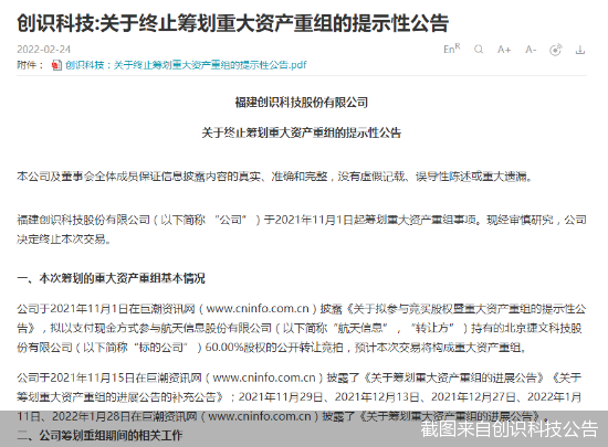 2月23日晚间,创识科技披露公告称,公司决定终止筹划重大资产重组事项,即参与捷文科技60%股权的公开转让竞拍。据了解,2021年11月1日,创识科技披露《关于拟参与竞买股权暨重大资产重组的提示性公告》,拟以支付现金方式参与航天信息股份有限公司(以下简称“航天信息”)持有捷文科技60%股权的公开转让竞拍,预计本次交易将构成重大资产重组。