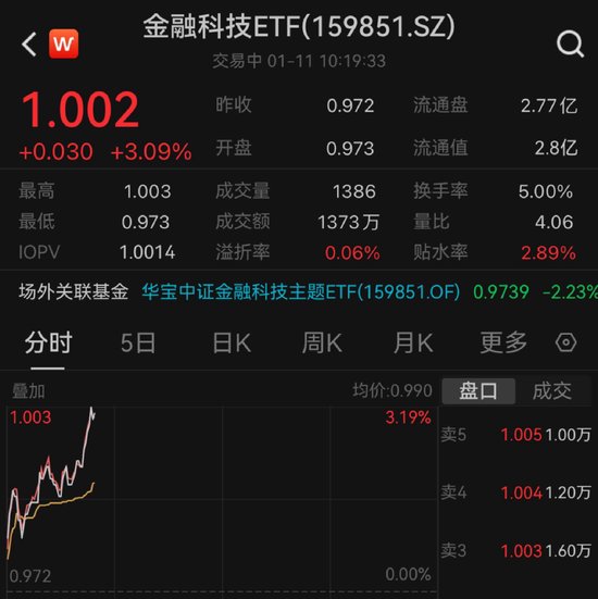 11日早盘,华为鸿蒙概念掀涨停潮,金融科技大幅走高!截至发稿,创识科技20%涨停,科蓝软件大涨超11%,证通电子、润和软件涨超6%。热门ETF方面,金融科技ETF(159851)开盘后快速上攻,现场内价格飙涨3%,有望终结6连阴,实时成交额快速突破1300万元!