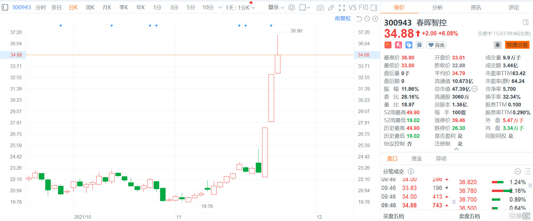 格隆汇11月23日丨春晖智控(300943.SZ)大涨逾6%,报34.88元,高见36.9元,以高点计,近三日累计最大涨幅达61%,总市值47亿元。春晖智控昨日发布股票交易异常波动公告,目前,公司加氢设备电磁阀已向客户送样,正处于客户样品验证阶段,尚未批量生产,也未形成销售收入。