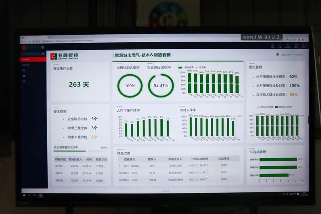 智慧城市燃气:该车间的主要产品包括燃气输配、工程技术中心、智慧燃气三大部分,车间内设有春晖智控与霍尼韦尔公司共同开发的Bi看板,实时显示技术制造、采购、仓储等关键指标的数据。