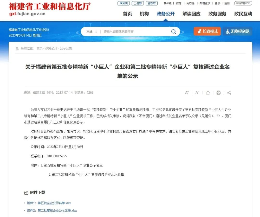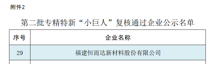 7月14日,福建省工业和信息化厅发布“福建省专精特新‘小巨人’复核企业名单”结果公示,经过严格的资格审查认定,恒而达成功通过复核,再次获得专精特新“小巨人”荣誉!