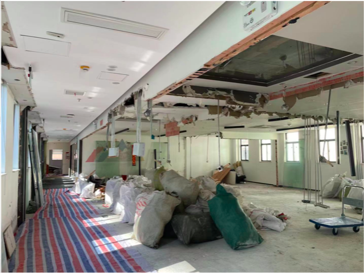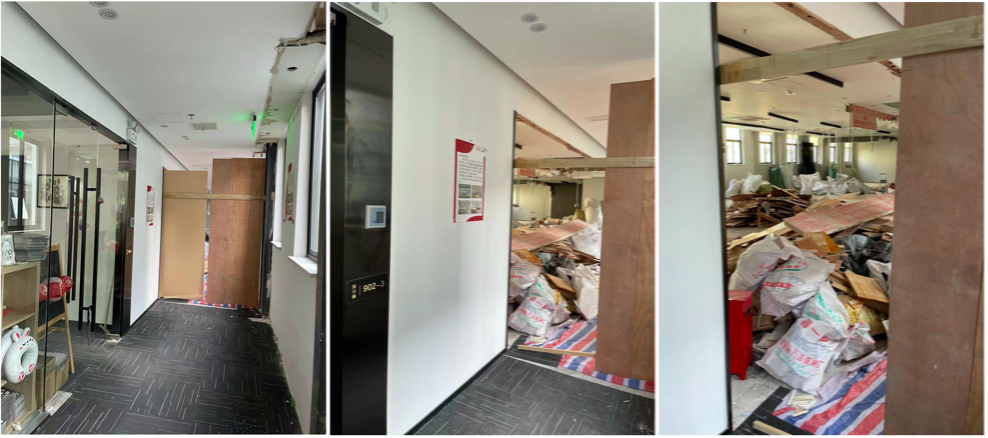拒绝上述方案后,小朱开始寻找新的办公场地,并向德必集团承诺寻找到合适房源后会搬离。但之后德必集团在9层办公区贴出了改造通知,并开始拆除9层的公共区域,包括会议室等。9月10日,当小朱再回到9层时,公共区已成一堆废墟。