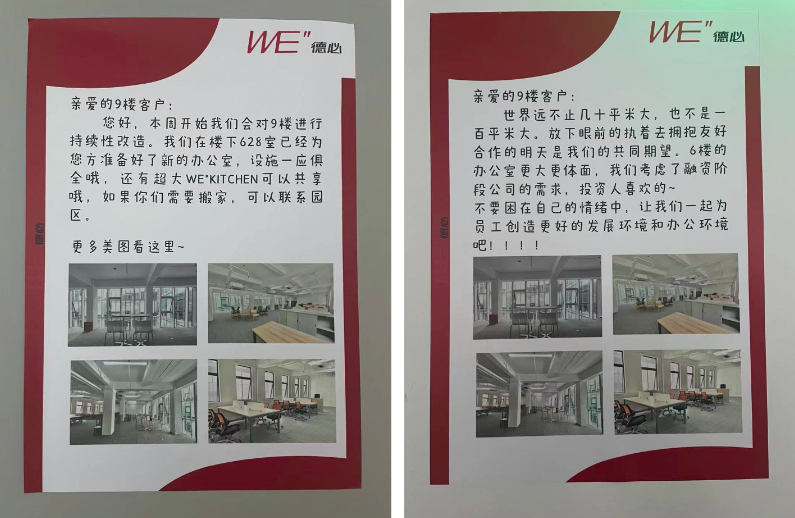 不过,当36氪向德必集团核实上述小朱提及的经过时,德必集团回应称并不属实。其表示,目前租户仍在9层正常办公,并且此前9层装修已征得租户同意。此外德必集团还表示,在协商过程中其工作人员曾提出包括赔偿、置换更大办公室、维持原有房租不变等解决方案,但租户未采纳。而在租户拒绝后,其目前仍享有与园区其它客户一致的服务保障,园区对该客户办公场所保持不变。