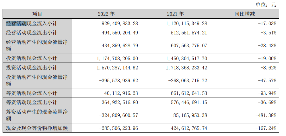 2022年度,德必集团现金及现金等价物净增加额为-2.86亿元,较上年同比下降167.24%。