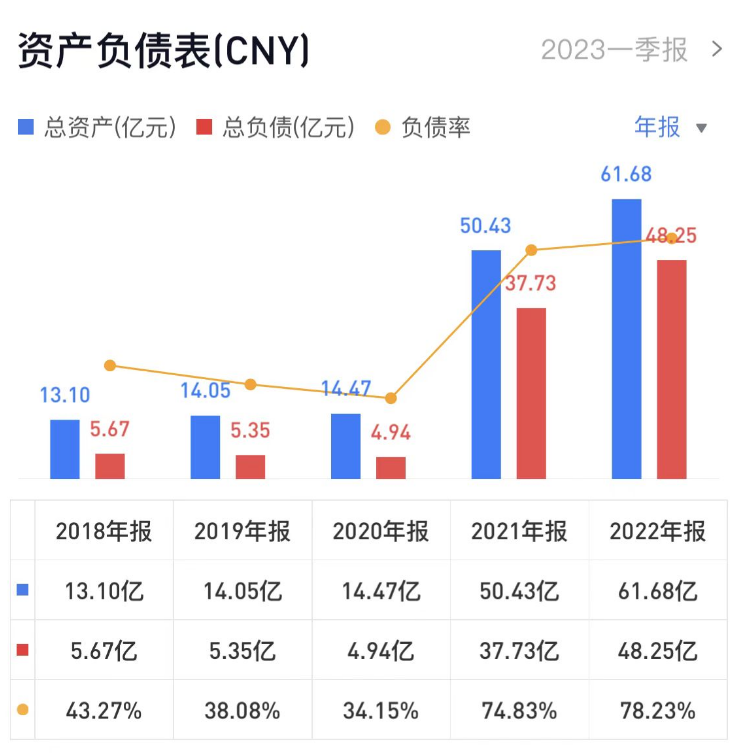 资料显示,2020年-2022年,德必集团负债率分别为34.15%、74.83%、78.23%。