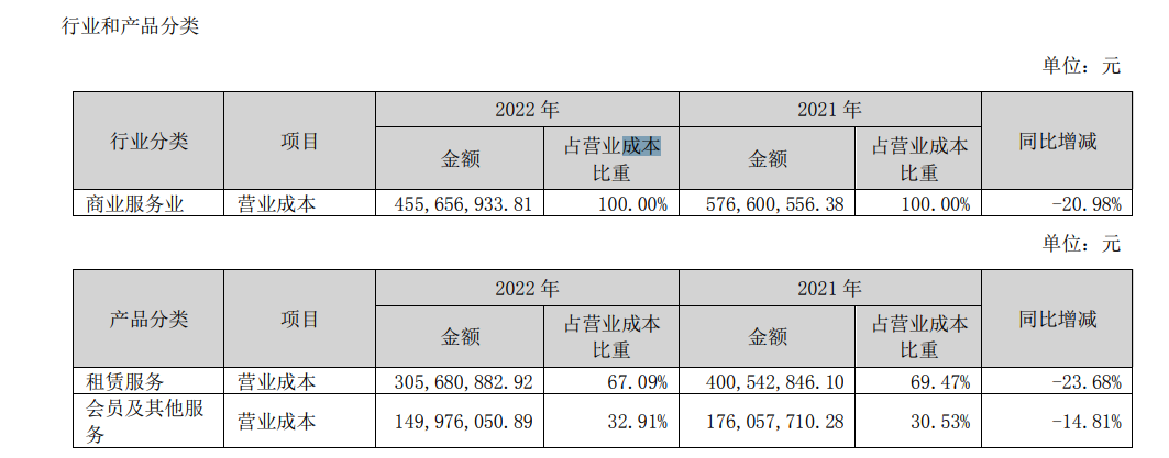 从营业成本构成来看,2022年商业服务业营业成本为4.56亿元,同比降20.98%;分产品来看,租赁服务营业成本为3.06亿元,同比降23.68%;会议及其他服务营业成本为1.5亿元,同比降14.81%。