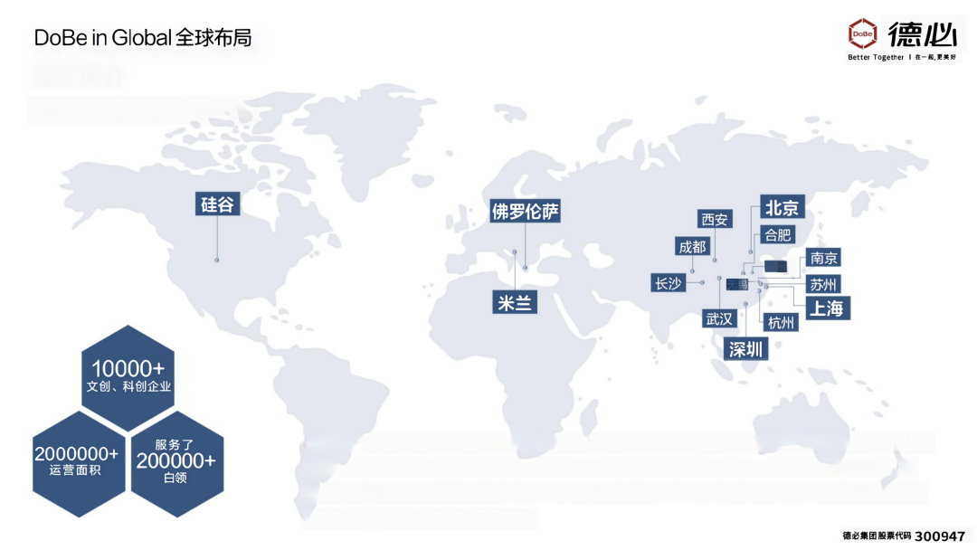 德必集团致力于成为中国领先的文科创产业全价值链服务商。经过多年的发展,成功打造了多个具有行业影响力的项目,在全球十余个城市成功签约近百个文科创产业园区,吸引了众多优秀的文科创企业入驻,形成了产业集聚和生态闭环,推动了文科创企业的创新发展。此外,德必率先推出了“轻公司生态圈”发展战略,为园区内外企业、企业与个人、人与人之间搭建起连接桥梁,提供全方位的支持与服务。为会员提供包括创业辅导、品牌推广等在内的“十大会员服务”,并倾力打造集创意、设计、交流于一体的平台,助力企业实现创新突破。德必集团始终致力于推动文化产业的发展,为文创企业的成长壮大贡献自己的力量。