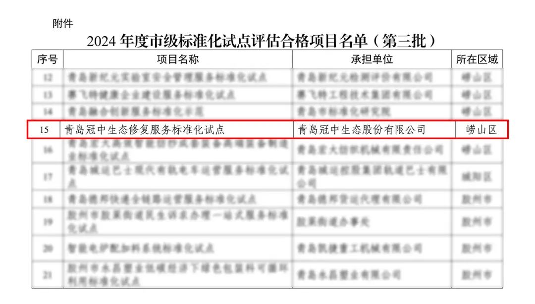 近日,青岛市市场监督管理局发布《关于公布2024年度市级标准化试点评估合格项目(第三批)的通知》。冠中生态承担的“青岛冠中生态修复服务标准化试点”项目顺利通过验收评。