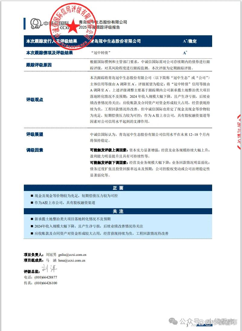不过,中诚信国际也肯定了冠中生态现金及现金等价物较为充足,短期偿债压力较为可控。