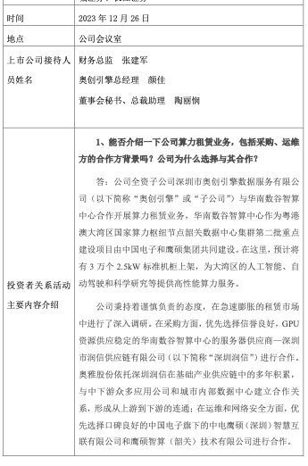 奥雅股份向投资者介绍了公司算力租赁业务,包括采购、运维方的合作方背景,以及公司为什么选择与其合作等情况。公司全资子公司深圳市奥创引擎数据服务有限公司(以下简称“奥创引擎”或“子公司”)与华南数谷智算中心合作开展算力租赁业务,华南数谷智算中心作为粤港澳大湾区国家算力枢纽节点韶关数据中心集群第二批重点建设项目由中国电子和鹰硕集团共同建设。在这里,预计将有3万个2.5kW标准机柜上架,为大湾区的人工智能、自动驾驶和科学研究等提供高性能算力服务。