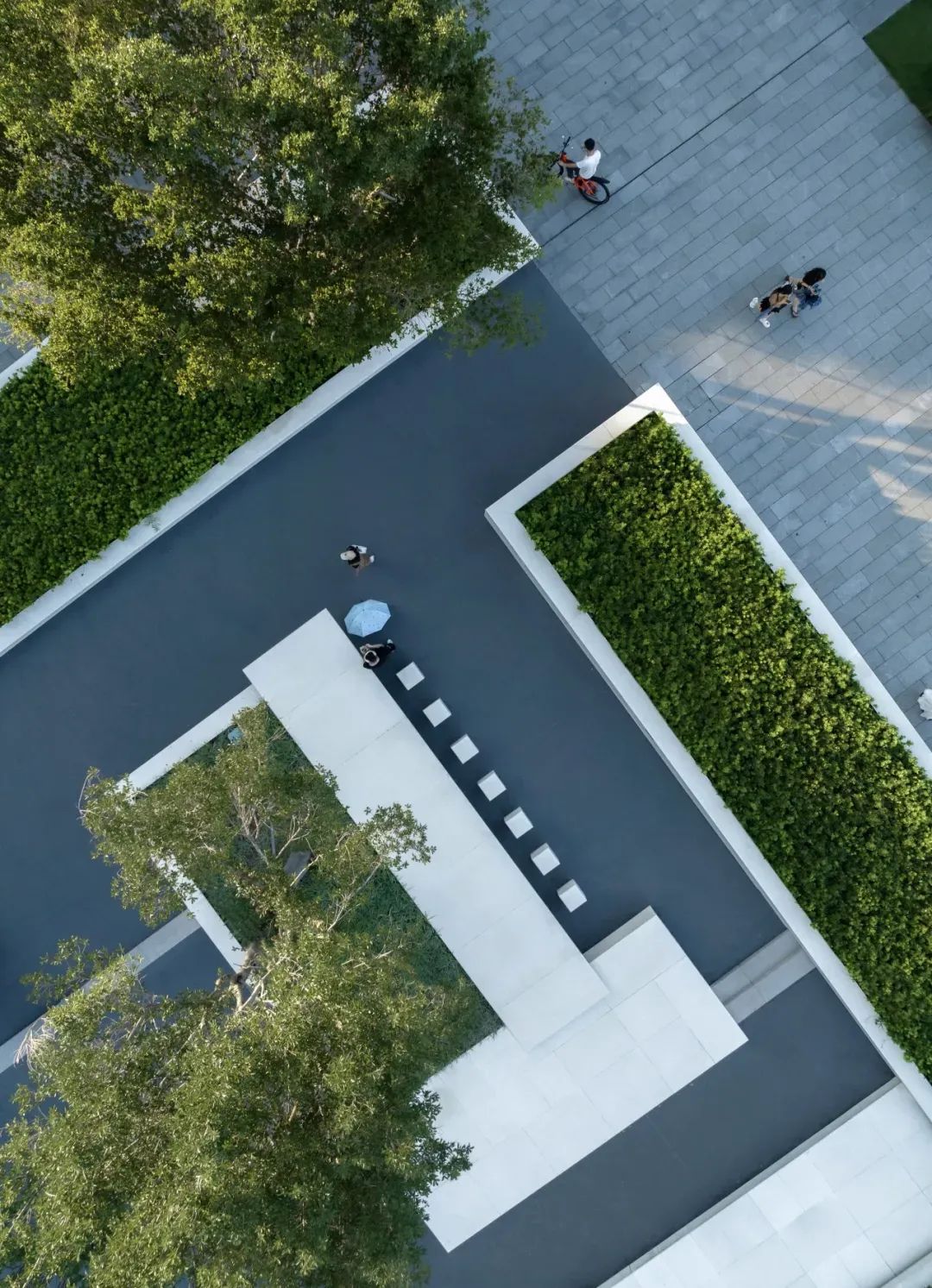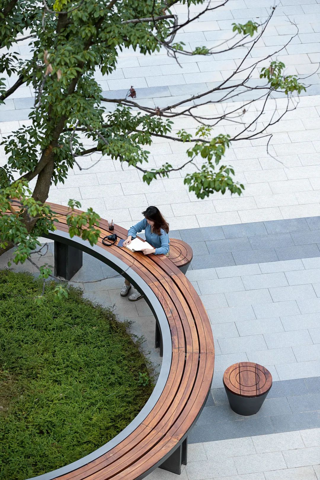 在整个办公园区最集中的户外活动场地,项目将其设置为一个整体开放的林下活动空间。经多维度的对比研究,设计团队最终选用56株榉树打造了集观赏、休憩功能为一体的榉树广场。