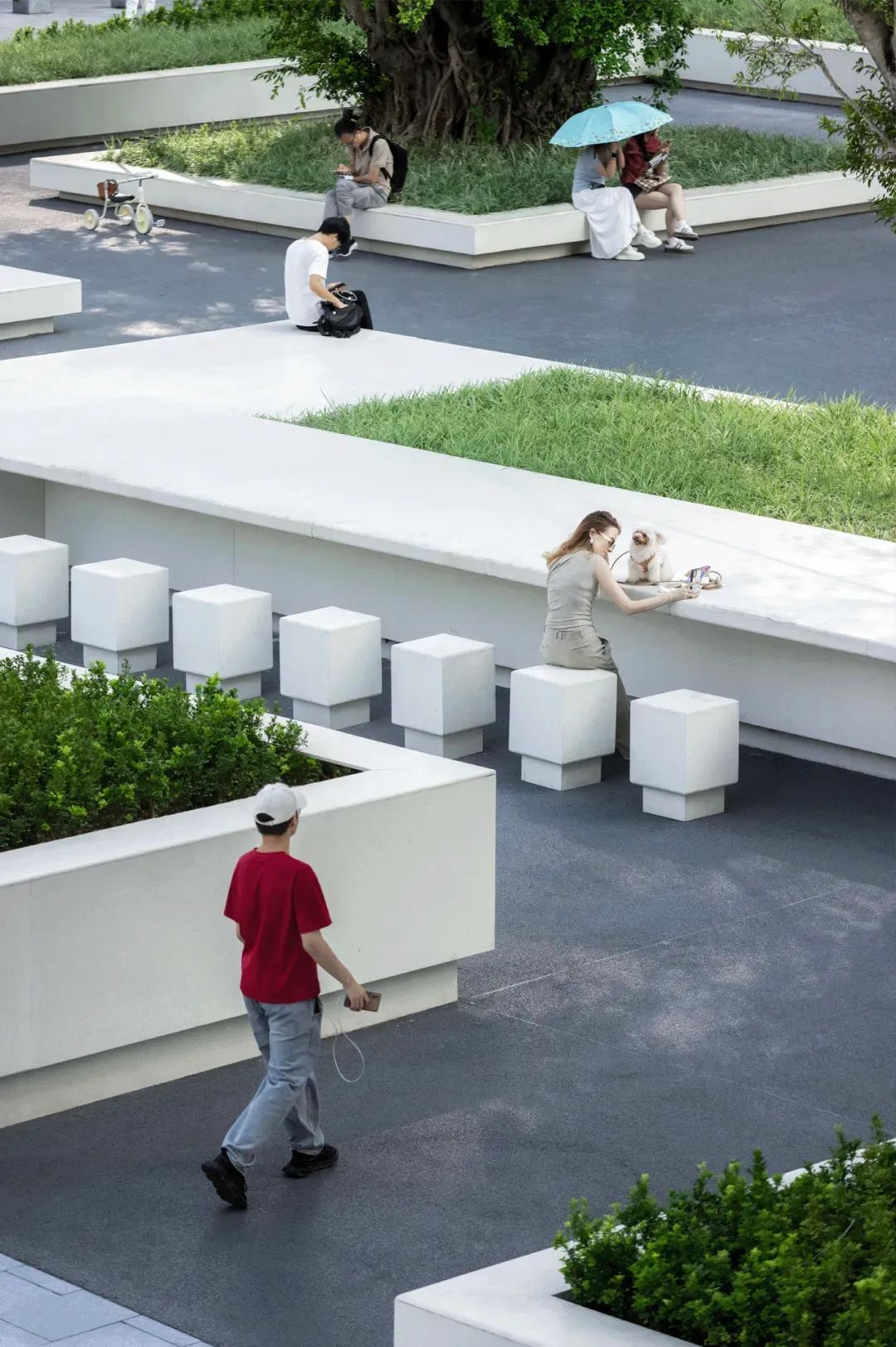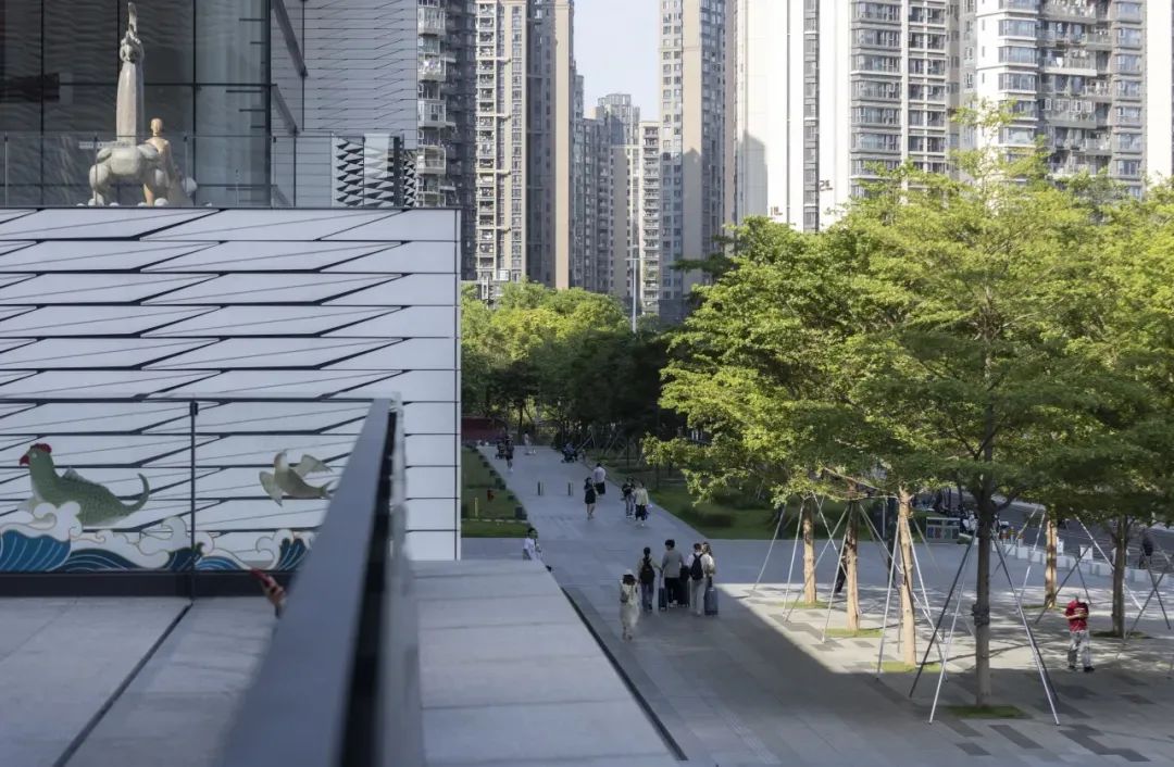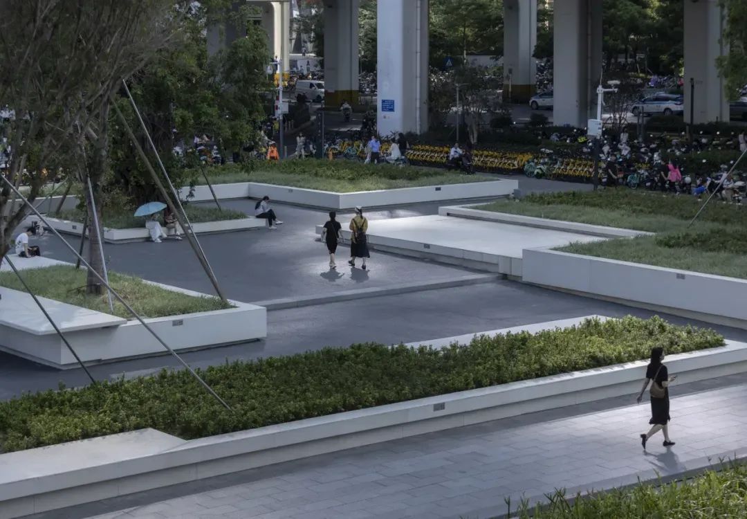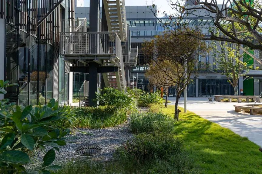 面对场地建筑占比大、绿化受限的挑战,奥雅股份采用嵌草铺装、隐形树穴及移动种植箱策略,不仅显著提升了绿化率,也满足了海绵城市设施要求,促进了水资源的自然循环。