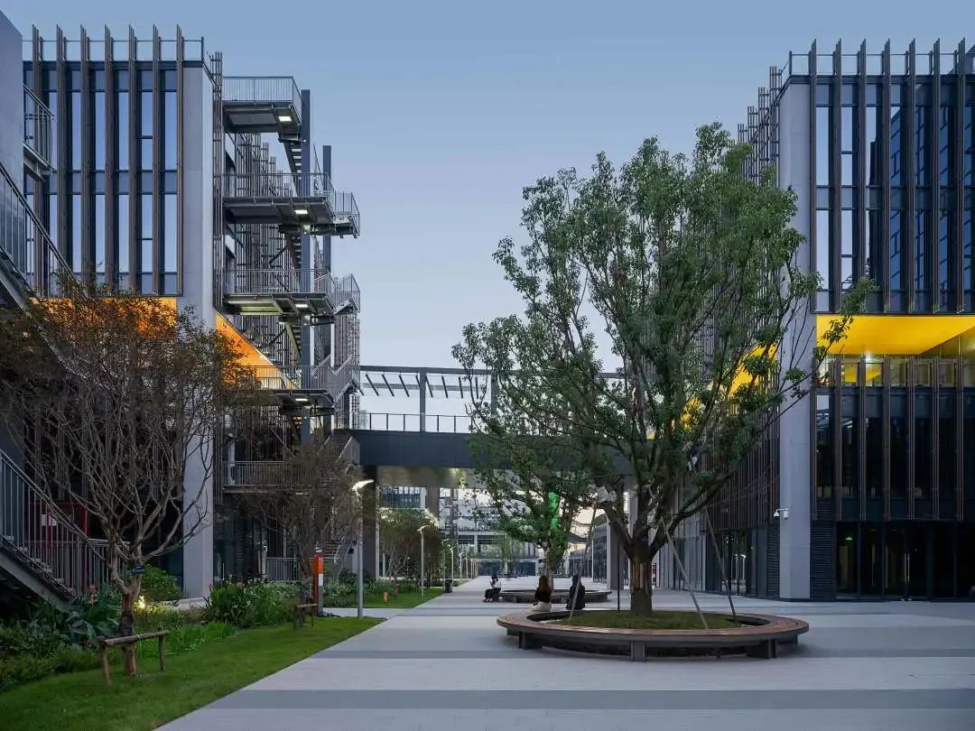与榉树广场一样,项目结合地形与入驻企业的需求,设置一处乌桕庭院。每年乌桕叶红时,从360度环形落地窗的办公室往外望去,一片红艳夺目,便知深秋。